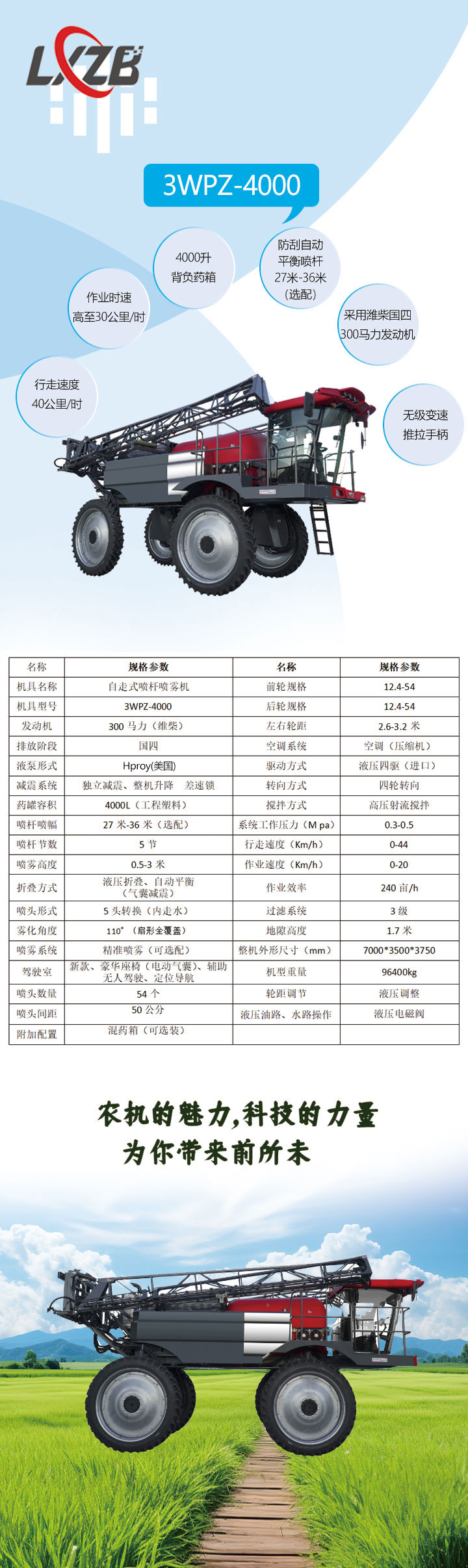 3WPZ-4000?噴藥切頂及一體的全液壓噴桿噴霧機。這款機器行走速度可達40公里每小時。作業時速可高達30公里每小時3WPZ-4000這款車搭配4000升背負式藥箱;30米防刮氣囊減震噴桿,搭配5頭轉換進口噴頭。此機型采用濰柴國四排放標準300馬力發動機,ACE?757升流量進口泵,輪邊液壓驅動,進口液系統由PMP公司配套以及售后。