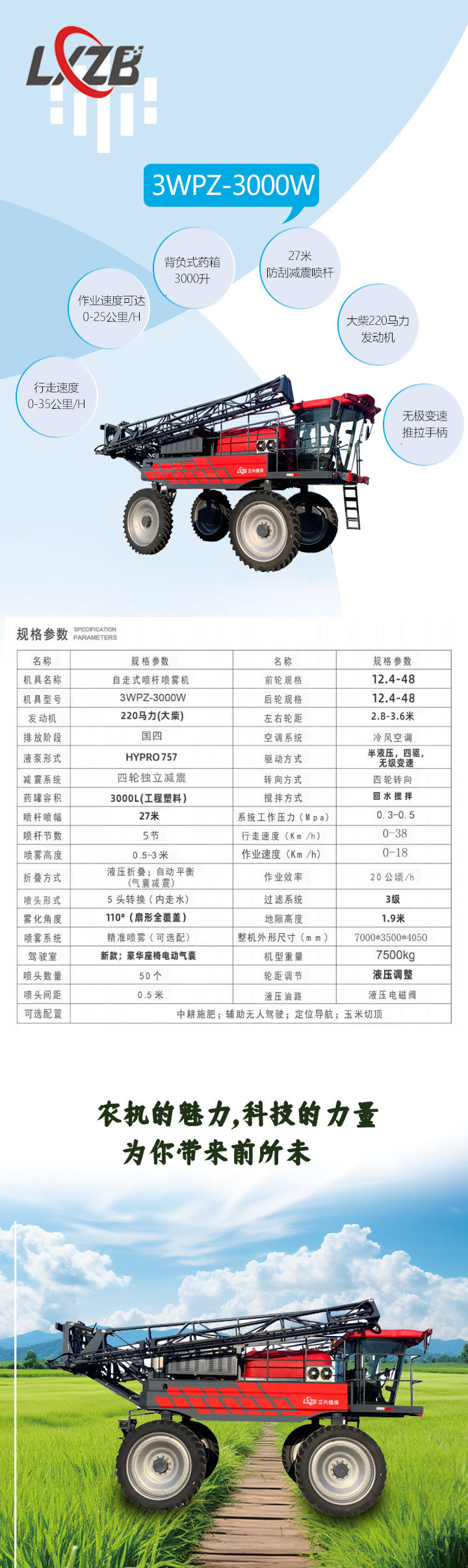 3WPZ-3000W噴藥切頂及一體的噴桿噴霧機行走速度可以達到0-35公里/H。作業速度根據作業條件可達0-25公里/H3WPZ-3000W搭配3000升的背負式藥箱;27米防刮減震噴桿,配備自動平衡功能。五頭轉換美國噴頭。此機型采用錫柴國四排放標準220馬力發動機。噴藥水泵采用美國HYPRO品牌大流量離心泵(757L/MIN)。機械液壓相結合的傳動方式是立興打藥機的獨有技術,已經在10余種機型,2000多臺機器上配套使用,技術成熟可靠。原理(伊頓液壓大崩傳動液壓馬達,液壓馬達傳動變速箱;利用變速箱換檔提升扭矩。這套驅動技術大幅度提升了該車型的防陷能力搭配四輪獨立懸掛,減震效果優 秀,在坑洼地塊駕駛感舒適。經過長時間高負荷泥濘地面測試。整體通過性及強。無極變速推拉手柄操作行走非常簡單,整車全部功能都可以在扶手箱電控按鍵上進行操作。新款豪華駕駛室,氣動懸浮座椅。進口智能噴霧系統、噴霧系統外走水單體110°全覆蓋噴灑,回水攪拌,三級過濾,液壓操作,可加裝精準噴霧,實現精準噴灑不浪費藥液,達到高 效使用效果,提高了該機型操作 安 全 性,使用可靠性,維護便捷性及舒適性。