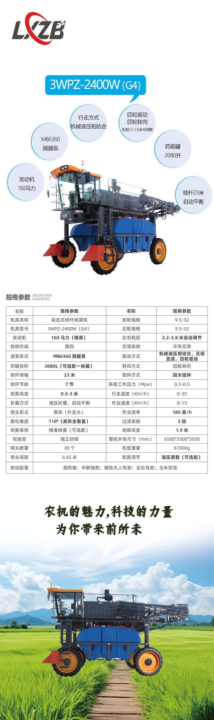 3WPZ-2400W(G4)自走式噴桿噴零機是一種集噴藥,切頂,施肥等功能于一體的噴藥設備此機型采用錫柴國四排放標準160馬力發動機,MB6360隔膜泵,配備全封閉獨立駕駛室,該機型行走方式采用機械液壓相結合的傳動方式。機械液壓相結合的傳動方式是立興打藥機的獨有技術,已經在10余種機型,2000多臺機器上配套使用,技術成熟可靠。