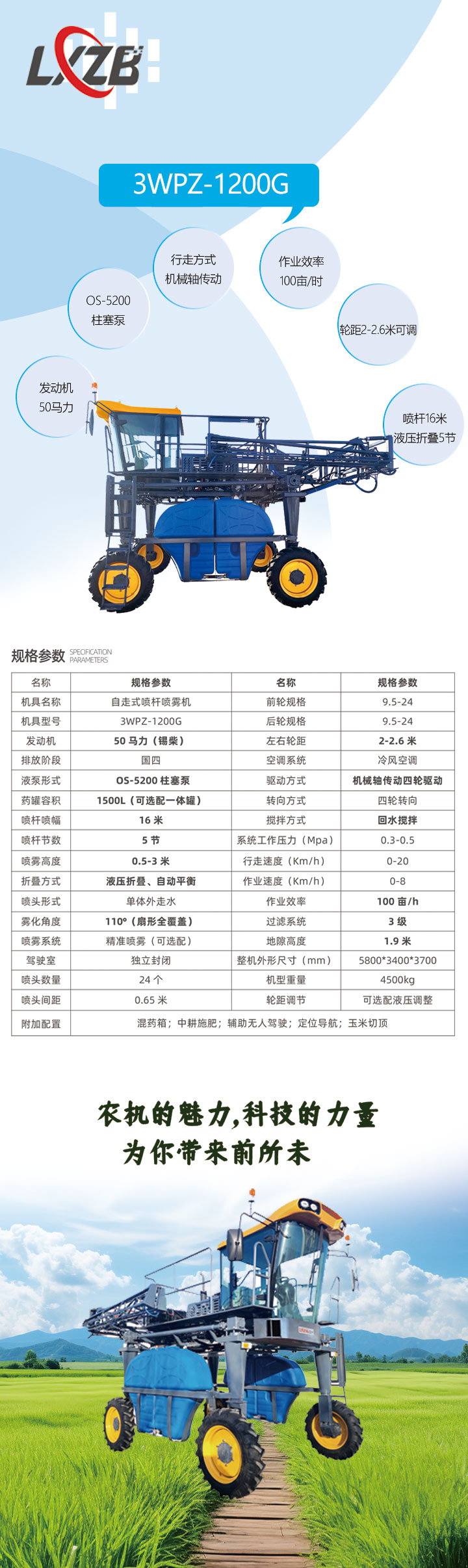 3WPZ-1200G自走式噴桿噴零機(jī)是一種集噴藥,切頂,施肥等功能于一體的噴藥設(shè)備此機(jī)型采用錫柴國(guó)四排放標(biāo)準(zhǔn)發(fā)動(dòng)機(jī)50馬力,配備全封閉獨(dú)立駕駛室,05-5200柱塞泵,4+1共五個(gè)擋位4個(gè)前進(jìn)擋位一個(gè)后退擋位。該機(jī)型行走方式采用機(jī)械軸傳動(dòng)這款傳動(dòng)方式在泥濘道路中驅(qū)動(dòng)力強(qiáng),脫因能力強(qiáng),輪距2米-2.6米可調(diào)節(jié)(可選配液調(diào)節(jié)輪距)四輪驅(qū)動(dòng)四輪轉(zhuǎn)向,輪距可調(diào)整,設(shè)計(jì)結(jié)構(gòu)合理,維修便捷,作業(yè)質(zhì)量好,作業(yè)效率可達(dá)每小時(shí)100畝。各項(xiàng)性能指標(biāo)均超過(guò)國(guó)家有關(guān)標(biāo)準(zhǔn)要求。