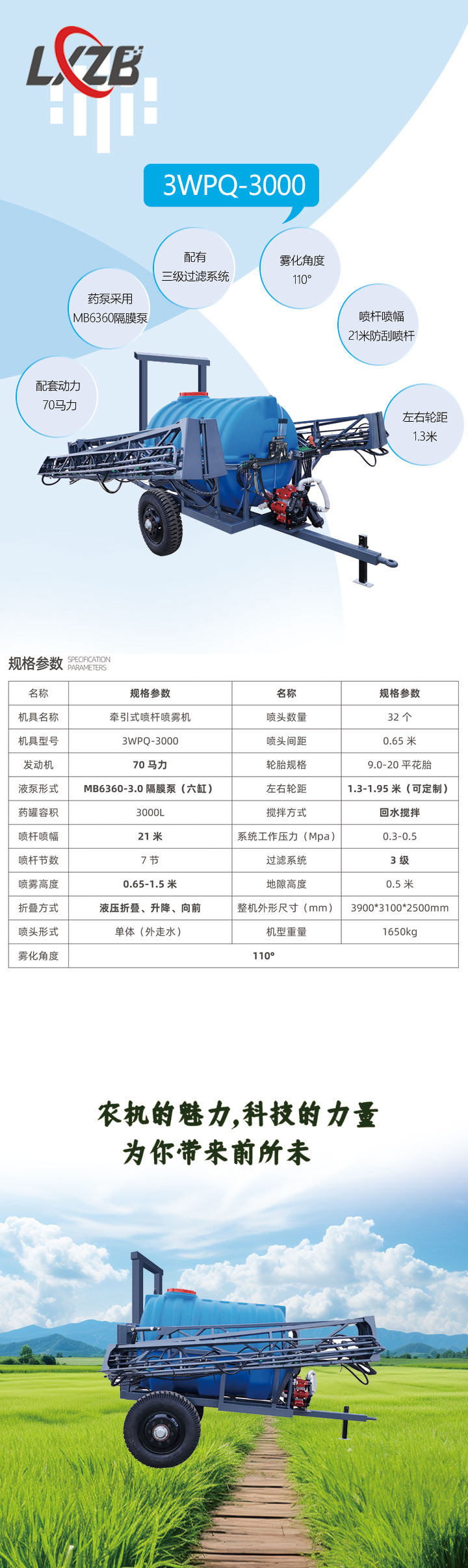 3WPO-3000牽引式噴桿噴霧機,配套動力270馬力,藥泵采用MB6360隔膜泵,配有三級過濾系統(tǒng),回水?dāng)嚢韫δ埽幭淙莘e3000L,噴桿噴幅21米防刮噴桿,噴霧高度0.65-1.5米,霧化角度110°,噴桿液壓折疊升降,左右輪距1.3米(可定制)地隙高度0.5米,適合中大型平原地塊噴灑作業(yè)需求。